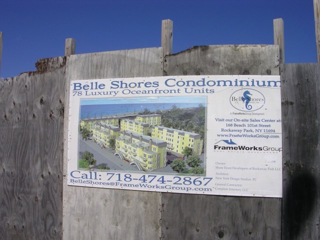 Money makes people (and organizations) do irrational things. Take a perfectly sensible developer like The Frameworks Group, which built the lovely and successful, low-rise, Belle Shores Condominiums on Shorefront Parkway in Rockaway Park, near St. Camillus and The Irish Circle. Fabulous homes. With their own private parking spots! Neighborhood loves them. Why mess it all up by proposing a 6-story tower less than 10 blocks away in Rockaway Beach that will draw the ire of homeowners adjacent to the site? Maybe because the “other guys” got to build their big, air and light-gobbling towers nearby, before the zoning was changed to prevent it?