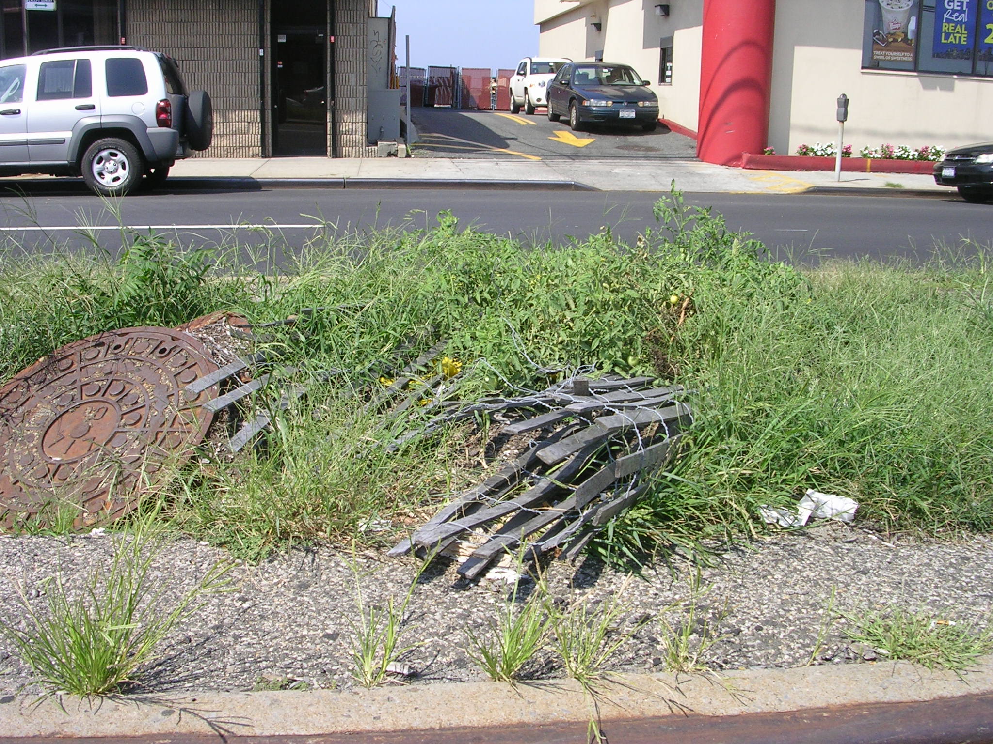 I was idling at the traffic light near the Waldbaums’ plaza in Rockaway Park last week. I casually gazed out my car window toward the Wendy’s Restaurant. There, growing on the median strip, were two tomato bushes (with several good-sized green fruits hanging on them). I did a double take, then grabbed my camera and snapped a photo. I came back the following day, figuring I might have been hallucinating. There they were, amid the weeds, almost covered by a rolled-up piece of wooden fence.